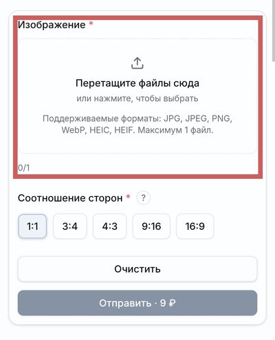 Нажмите на поле «Изображение» или перетащите файл в область загрузки. Поддерживаются форматы: JPG, PNG, WebP, HEIC, HEIF и другие популярные.