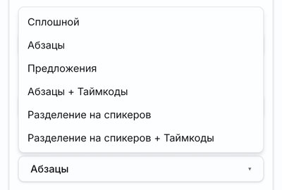Комбинация деления на абзацы и таймкодов (отметки времени в тексте, удобно для навигации по длинным записям).