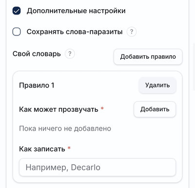 Создать собственные правила расшифровки. Это востребовано, когда в речи встречаются имена, названия мест, бренды и специальные термины. Напишите как может слово звучать в речи, а ниже эталонное написание.