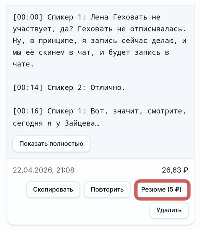 Расшифровали рабочий созвон с несколькими участниками. В настройках указали, что нужно деление на спикеров и тайм-коды.