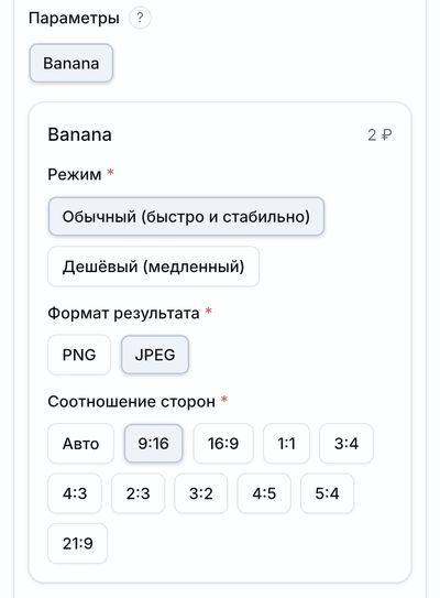 В блоке Нейросети выбираем Banana. Далее указываем способ генерации (быстрее и дороже или медленнее, но дешевле), формат итогового файла (PNG для последующей обработки или JPG для использования как есть) и соотношение сторон (например, вертикальный формат 9:16 или широкий горизонтальный 21:9).