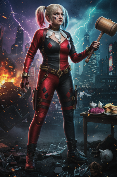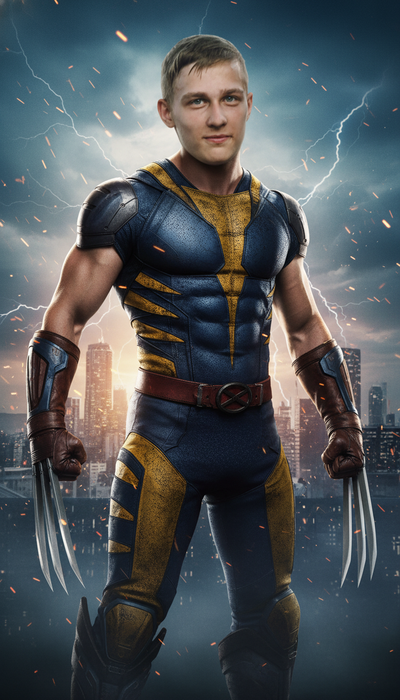 Фотореалистичный портрет в стиле супергероя [ИМЯ], сохранить лицо исходного фото максимально точно, реализовать костюм героя, добавить драматичное киношное освещение, фон с эпическими эффектами, стиль постера Marvel/DC, высокая детализация, 8K