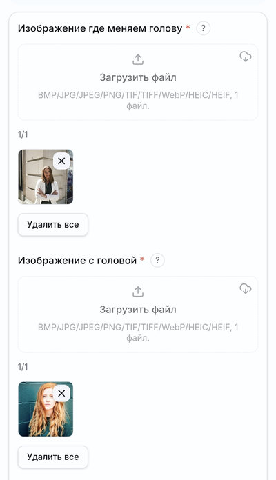В блоке Изображение с головой загрузите фото, откуда нужно взять голову (лицо + волосы + контур).