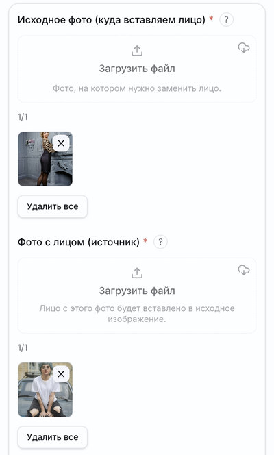 В блоке Фото с лицом (источник) загрузите изображение, с которого нужно взять лицо. Лучше всего работает фото анфас, с хорошим освещением и без предметов, закрывающих лицо.