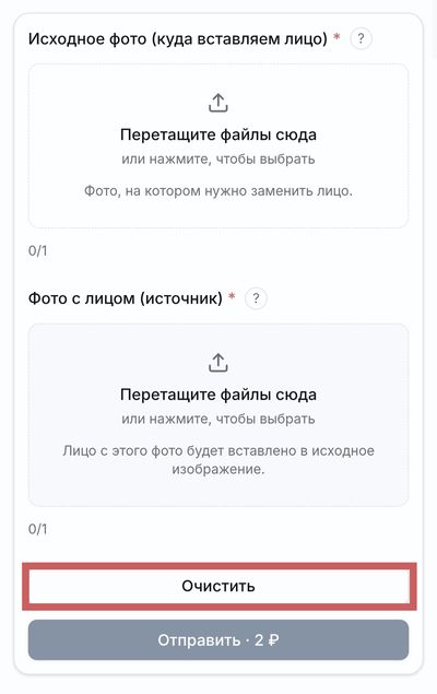 Нажмите кнопку Очистить, чтобы подготовить ещё одну замену лица с другими изображениями. Также используйте эту кнопку, если загрузили не те фото и хотите быстро сбросить всё в исходное положение.