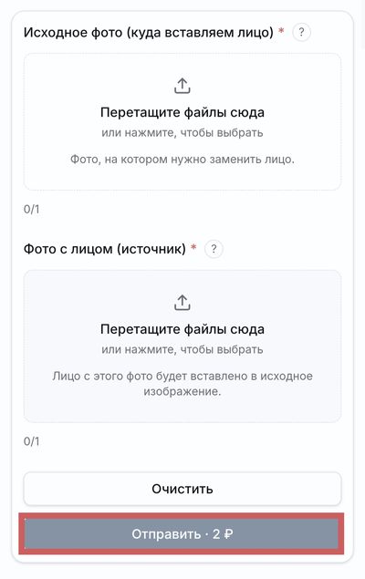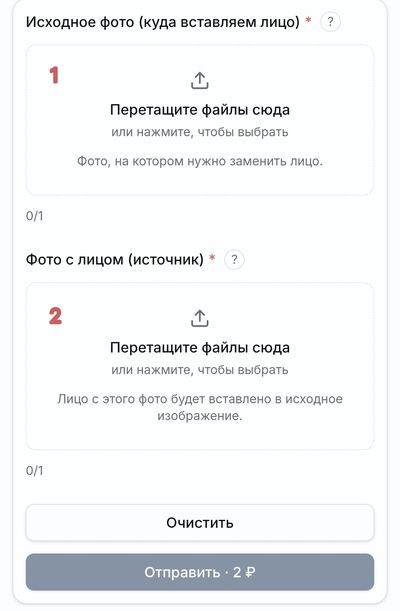 В поле Фото с лицом (2) загрузите фото лица, которое будет подставлено в Исходное фото.