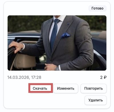 Просмотрите готовое изображение и нажмите Скачать для сохранения. Здесь же можно изменить задание, загрузив новое лицо или исходное фото, а также повторить обработку и вовсе удалить результат, если он не понравился.