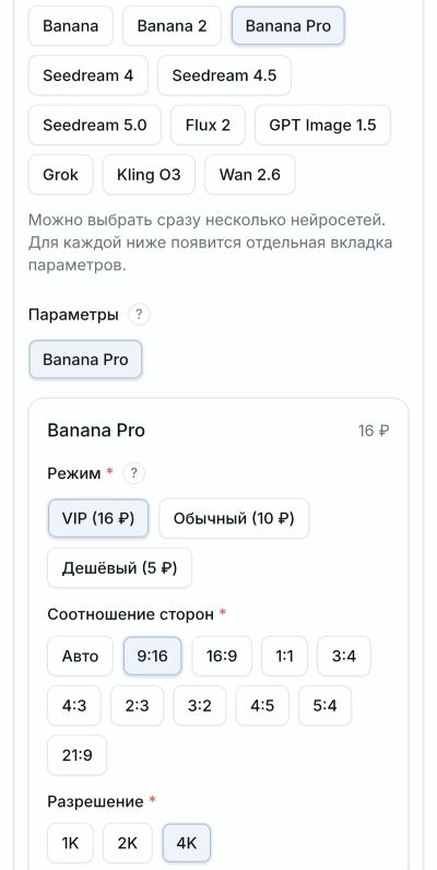 В настройках укажите Nano Banana Pro. Задайте параметры генерации: режим (VIP - самый быстрый), соотношение сторон и разрешение.