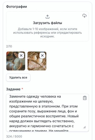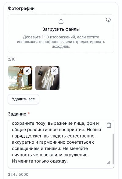 ✅ Уточняйте в промпте детали: цвет, материал, фасон, как вещь должна сидеть (облегающе, свободно).