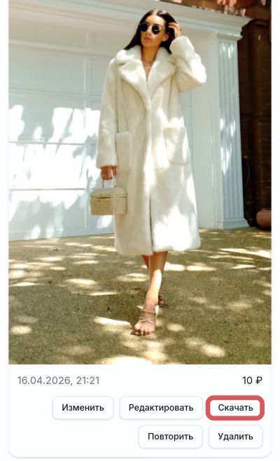 Нажмите кнопку Скачать в результатах или повторите генерацию с уточнённым промптом, если нужно.