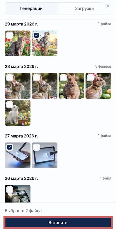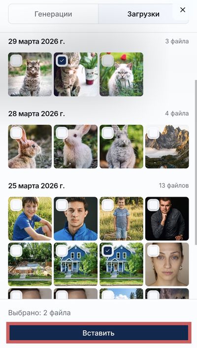 Загрузки: все файлы, которые вы загружали для обработки. Файлы удобно группируются по датам и представлены в виде привычной плитки. Выберите один или несколько файлов, а затем нажмите Вставить.